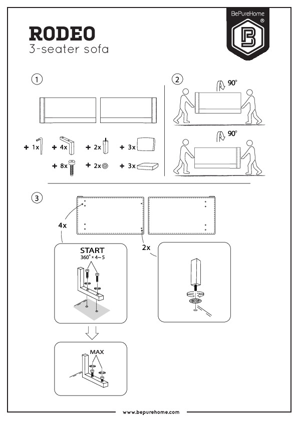Rodeo 3-sitssoffan levereras i två paket. Benen är enkla att montera med hjälp av de medföljande monteringsanvisningarna. För att skydda hårda golv, placera filtglidare på undersidan av benen.