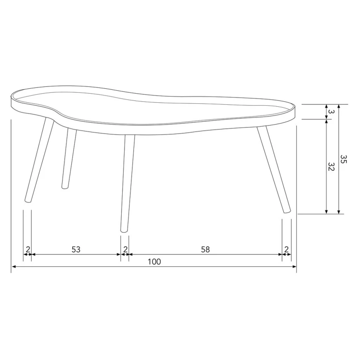 - Detta smala sidobord har en höjd på 35 cm och är cirka 100 cm brett och 58 cm djupt. Bordsskivan har en upphöjd kant som är 2 cm hög. Benen har en höjd på 32 cm och löper från toppen ø 3 cm avsmalnande till ø 1,5 cm. Själva bordet väger 5 kg och har en maximal bärvikt på 5 kg.