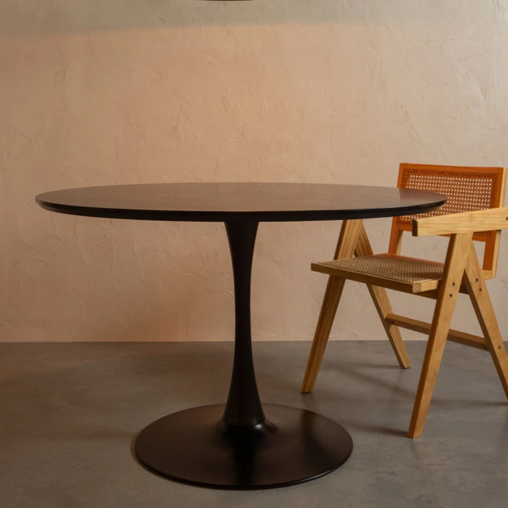 • Matbordet Sammy utnyttjar det tillgängliga utrymmet optimalt, trumpetfoten i metall ger generöst benutrymme. Sammy kommer från den exklusiva kollektionen från det holländska inredningsmärket WOOOD och har en djupsvart finish. Ett runt matbord ger en scen för trevliga middagar och livliga kvällar. Vem bjuder du in?