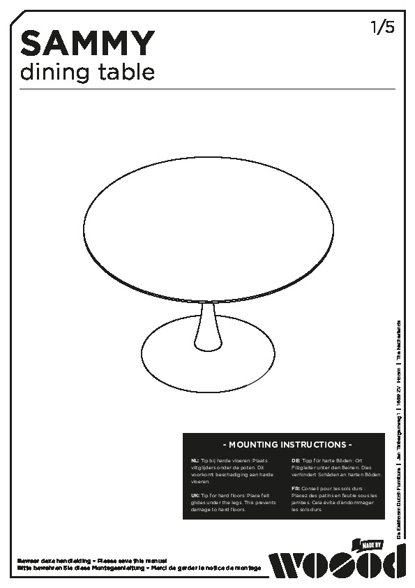 Artikeln levereras i två paket. Sammy är enkel att montera med hjälp av de bifogade monteringsanvisningarna. För att skydda hårda golv, placera filtglidare under benet.