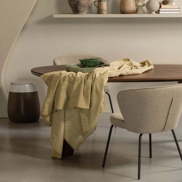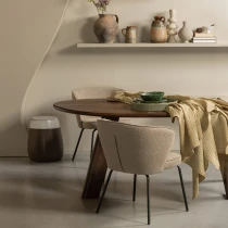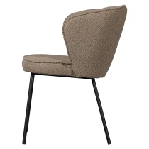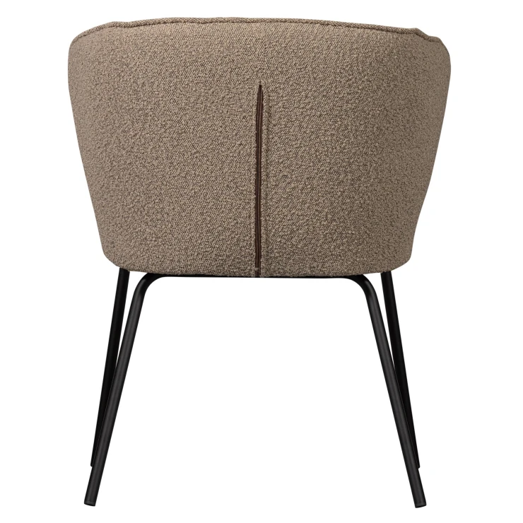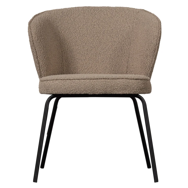 Underredet är tillverkat av mattsvart metall, vilket ger matsalsstolen ett tidlöst utseende. Sitsen är klädd i vårt mjuka Colmar bouclé-tyg. Materialet i Colmar bouclé-tyget svarar på den senaste trenden: mjuka material. Tyget är mjukt och har en elegant textur som omedelbart ger värme till ditt hem. Vårt Colmar bouclé-tyg har en Martindale på 100 000, vilket innebär att det är lämpligt för intensiv användning. Den täta väven säkerställer tygets styrka, vilket gör att boucléen sannolikt inte slits eller går sönder. Varje färg har också hög färgbeständighet, men det rekommenderas att undvika direkt solljus för att undvika färgnyanser.