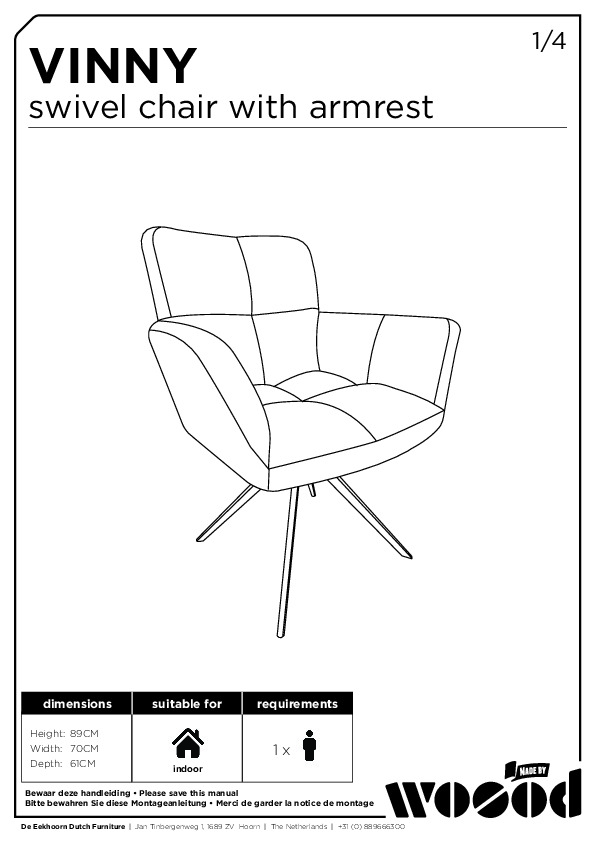 Vinny levereras i ett enda paket med tydliga monteringsanvisningar. För att skydda hårda golv, placera filtglidare under benen.