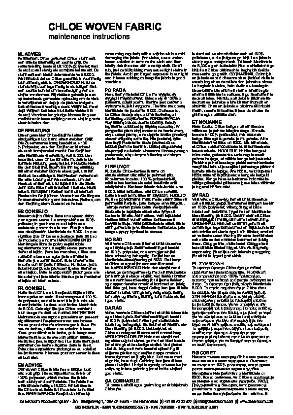 Vårt vävda Chloe-tyg har ett unikt utseende och mjukt grepp. Sammansättningen består av 100 % polyester, vilket gör tyget både robust och bekvämt. Tyget har ett Martindale-värde på 8 000. Vilket innebär att Chloe-tyget är lämpligt för måttlig till normal användning.