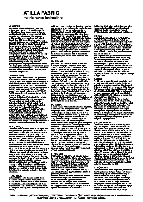 Attila-väven kräver lite skötsel. Vid fläckar rekommenderas att dutta med en lätt fuktad, ren trasa. Friktion kan orsaka ljusa fläckar. Impregnering av tyget anses inte nödvändigt, men om du vill impregnera tyget rekommenderar vi att du testar tyget på ett osynligt område.