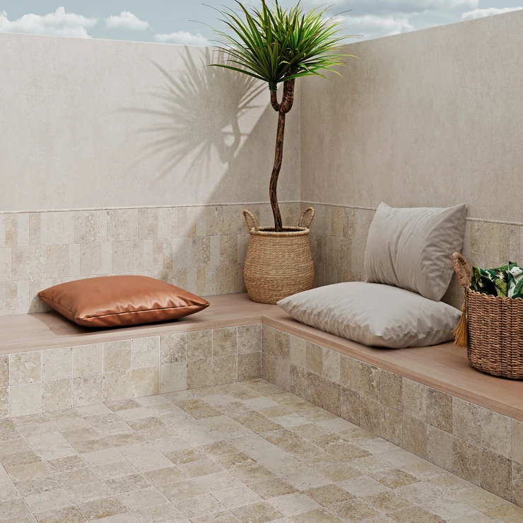 Kollektionen är frostbeständig och kompatibel med golvvärme, vilket gör den till ett hållbart och mångsidigt val för såväl privata som offentliga miljöer där naturlig textur och diskret elegans står i fokus.