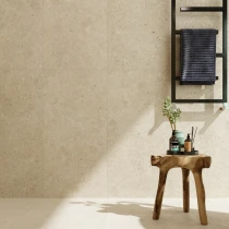 Kollektionen udmærker sig med sine trendy jordnære og dæmpede farvetoner, der afspejler dagens skandinaviske indretningstrends. I kombination med det realistiske kalkstensudseende får overfladen en naturlig, blød mat finish, der skaber en rolig og varm følelse i rummet.