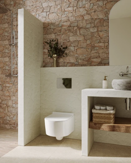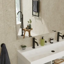 Kollektionen udmærker sig med sine trendy jordnære og dæmpede farvetoner, der afspejler dagens skandinaviske indretningstrends. I kombination med det realistiske kalkstensudseende får overfladen en naturlig, blød mat finish, der skaber en rolig og varm følelse i rummet.
