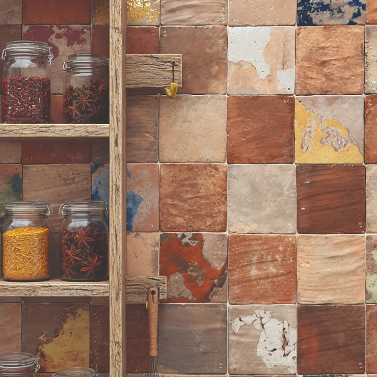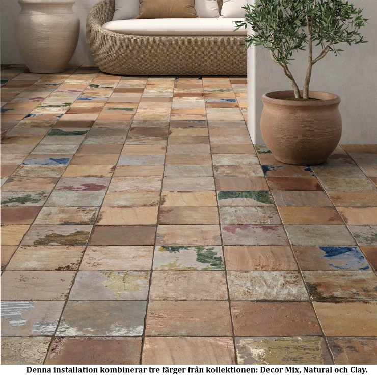 Farvepaletten er baseret på jordnære og mineralinspirerede nuancer, som spænder fra varme ler- og sandtoner til afdæmpede sten- og askefarver. Naturlige variationer mellem fliserne er en bevidst del af designet og bidrager til levende, harmoniske flader med et håndværkspræget udtryk.
