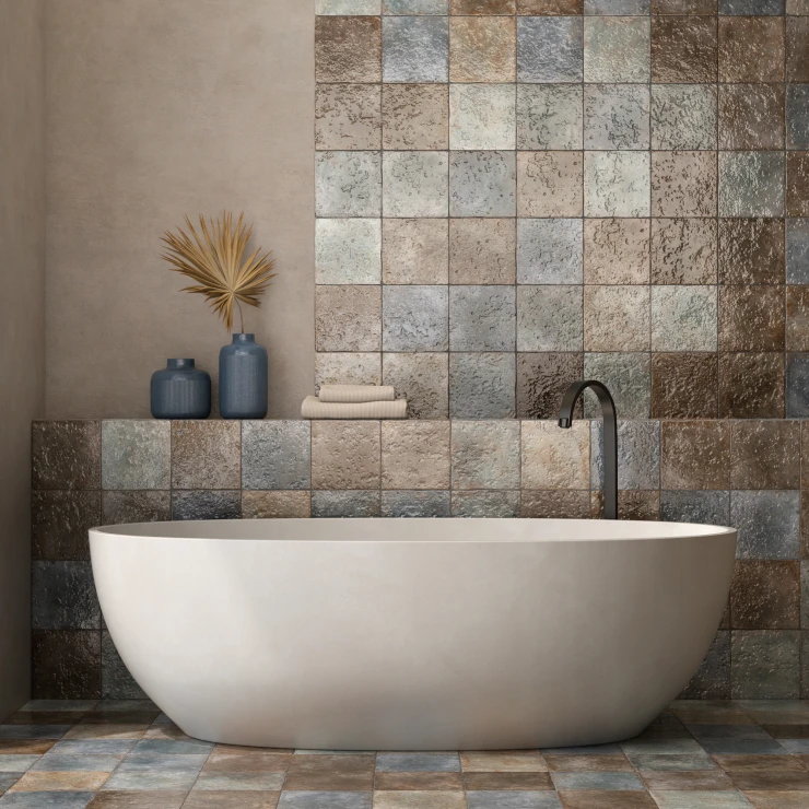 Den elegante mat–blank-finish giver et harmonisk samspil mellem bløde, matte flader og diskrete glansfulde detaljer. Dette tilfører dybde og lys, så overfladen fremstår dynamisk og nuanceret. Hver flise har afstemte uregelmæssigheder, som sikrer et rigt visuelt udtryk uden gentagelser.
