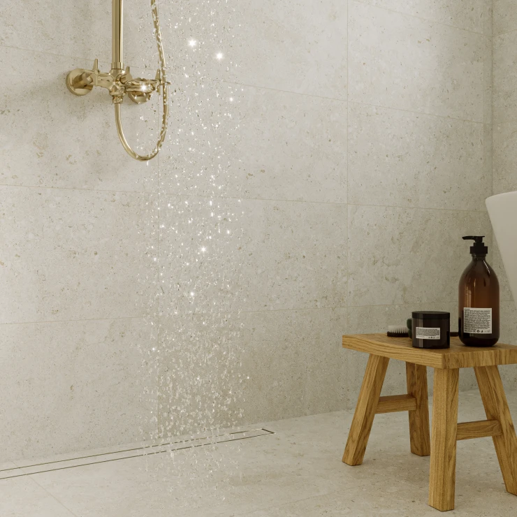 Den matte overflade og den fine stenåring gengiver på autentisk vis følelsen af ægte kalksten med en raffineret råhed, der tilfører dybde og karakter til ethvert rum.