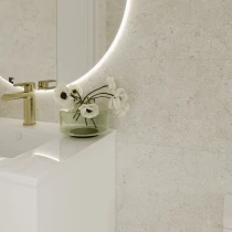 Den matte overflade og den fine stenåring gengiver på autentisk vis følelsen af ægte kalksten med en raffineret råhed, der tilfører dybde og karakter til ethvert rum.