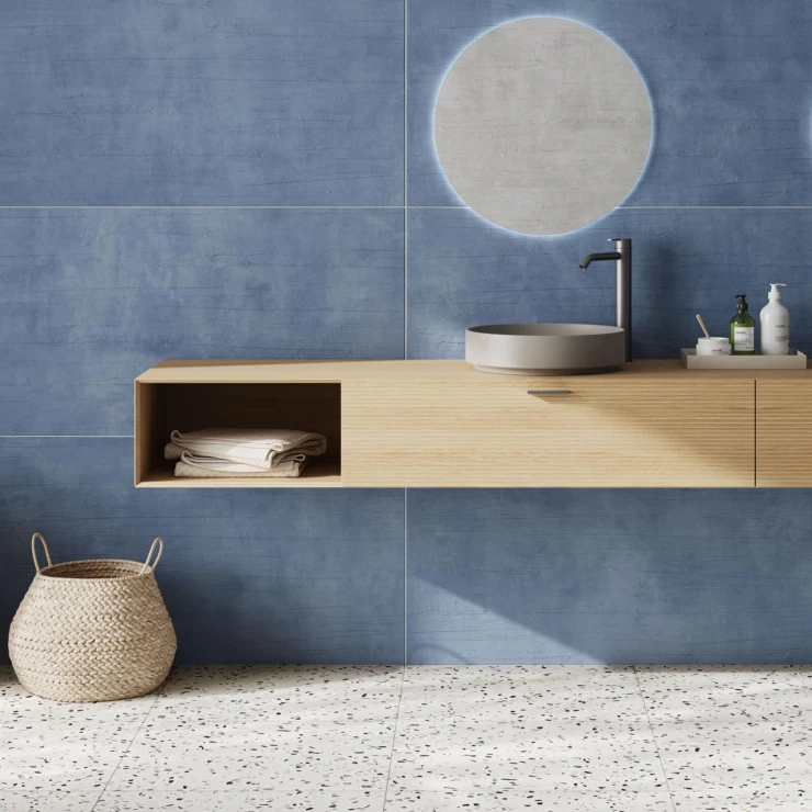 Klinker Tessera Blå Matt 60x60 cm från serie Tessera. Klinker 60x60 cm kan användas både till vägg och golv. Tessera har en matt yta med en rak kant. Det nominella måttet och annan specifikation på denna platta ni kan hitta i tabellbeskrivning. Denna platta har en terrazzo textur. Sök efter kollektionsnamnet (Tessera) för att se om det ingår i en serie som kanske erbjuder fler storlekar, samt andra färger. KLPM6619 - Vit 60x60.