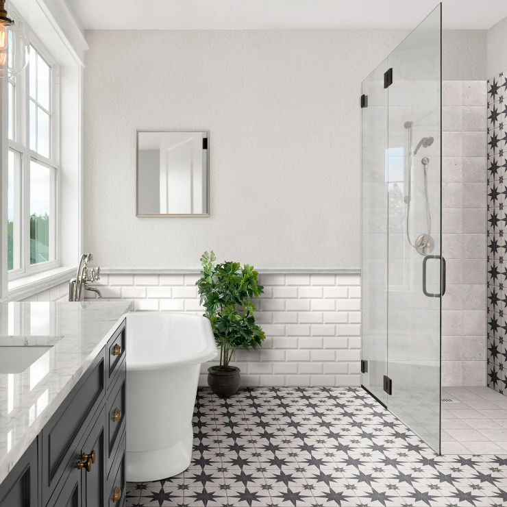 Compass fra Mainzu er en alsidig kollektion af granitkeramiske fliser inspireret af natursten og tidløst geometrisk design. Kollektionen er fremstillet i Spanien og kombinerer autentiske stenoverflader med elegante kompasmønstre - ideel til at skabe harmoniske og karakterfulde rum.
