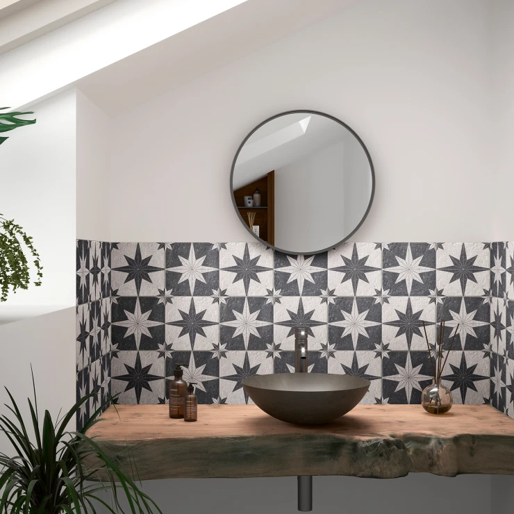 Compass fra Mainzu er en alsidig kollektion af granitkeramiske fliser inspireret af natursten og tidløst geometrisk design. Kollektionen er fremstillet i Spanien og kombinerer autentiske stenoverflader med elegante kompasmønstre - ideel til at skabe harmoniske og karakterfulde rum.