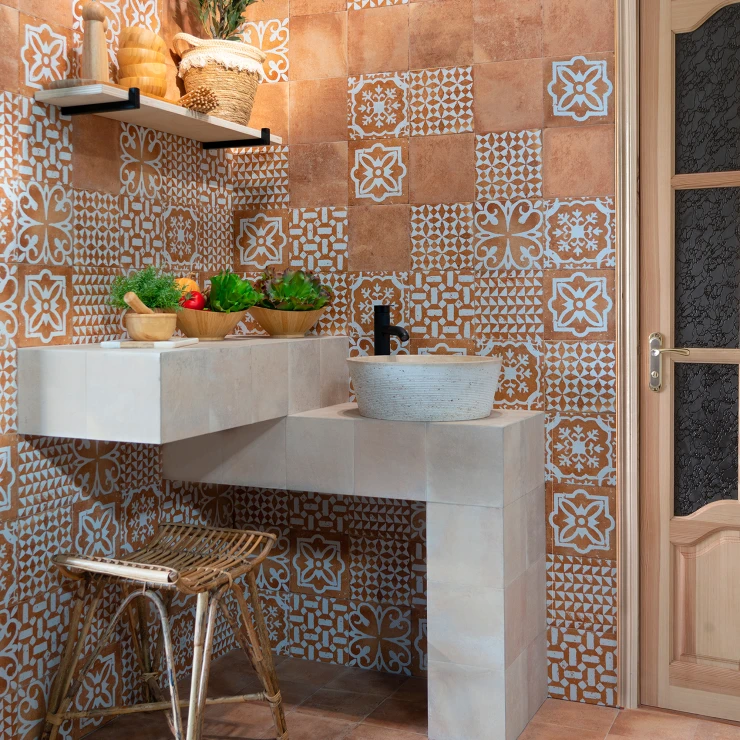 Kollektionen er fremstillet i højtydende granitkeramik og består af terracotta-inspirerede basisfliser samt matchende mønstrede fliser. Den naturlige farvevariation og den matte, strukturerede overflade giver et autentisk og jordnært udtryk - ideelt til både moderne og klassiske uderum.