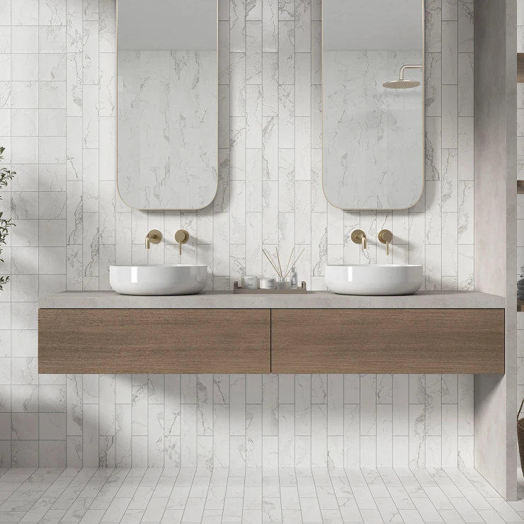 Niveo är en porslinskollektion inspirerad av marmorns tidlösa elegans. Med en matt yta och en subtil tredimensionell struktur får plattorna en taktil karaktär som tillför djup och mjukhet till det klassiska marmoruttrycket.
