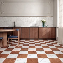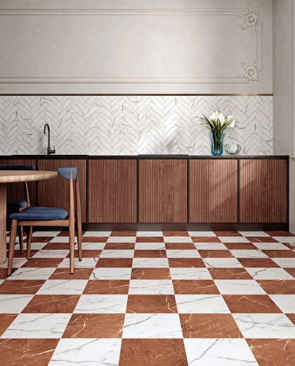 De forskellige formater kan kombineres med hinanden for at skabe et dynamisk og personligt design. 30x30-fliserne kan også lægges i rutemønster (skak), hvilket forstærker den klassiske marmorfølelse og giver et elegant, arkitektonisk udtryk.