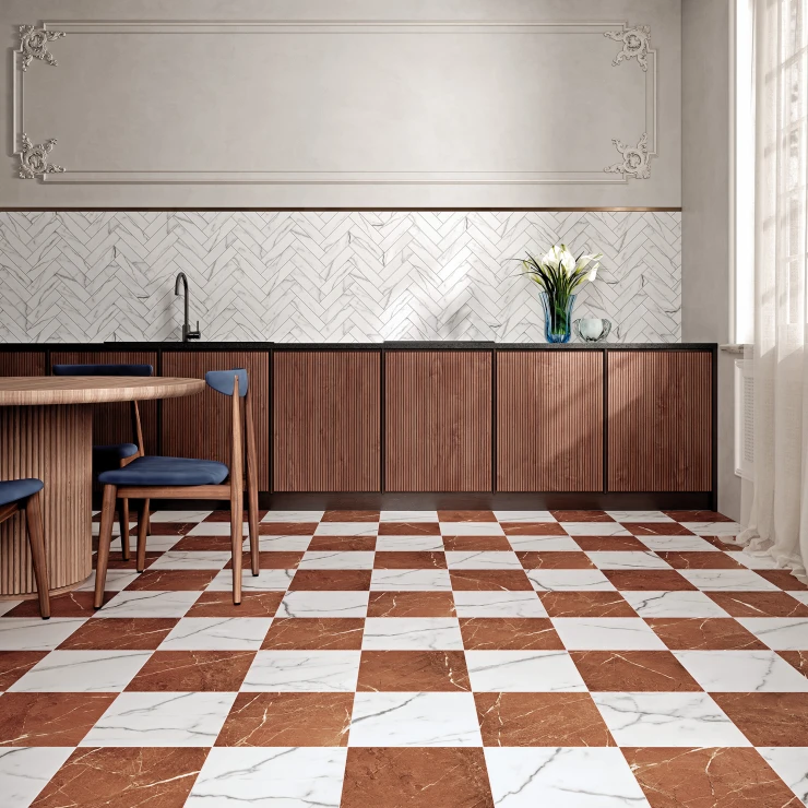 De forskellige formater kan kombineres med hinanden for at skabe et dynamisk og personligt design. 30x30-fliserne kan også lægges i rutemønster (skak), hvilket forstærker den klassiske marmorfølelse og giver et elegant, arkitektonisk udtryk.