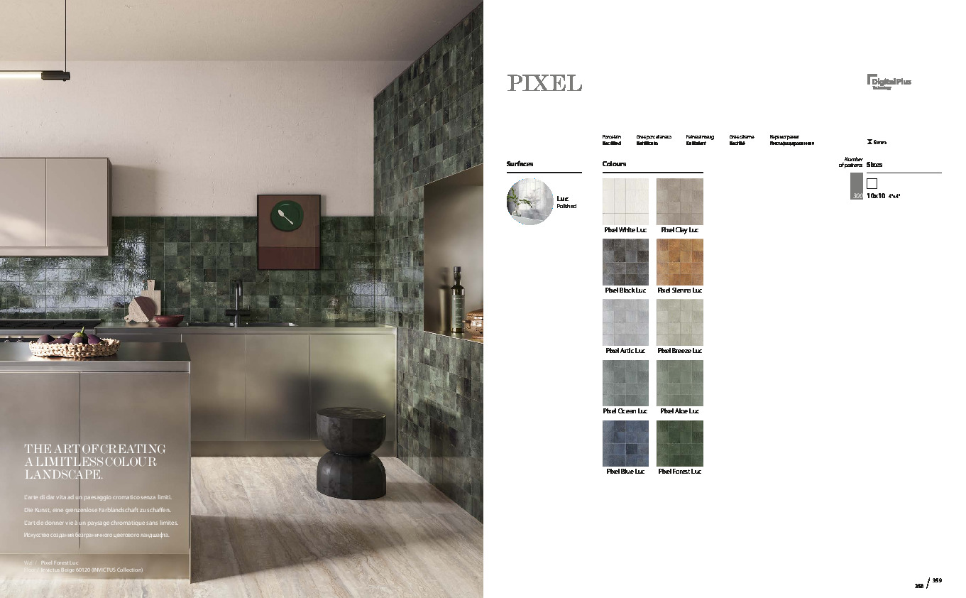 Oplev Pixel-kollektionen – en farverig og kreativ serie i porcelænsstentøj, der forvandler overflader til levende designudtryk. Med sit unikke 10x10 format og blanke finish tilfører Pixel lys, dybde og bevægelse og skaber dynamiske rum med masser af personlighed.