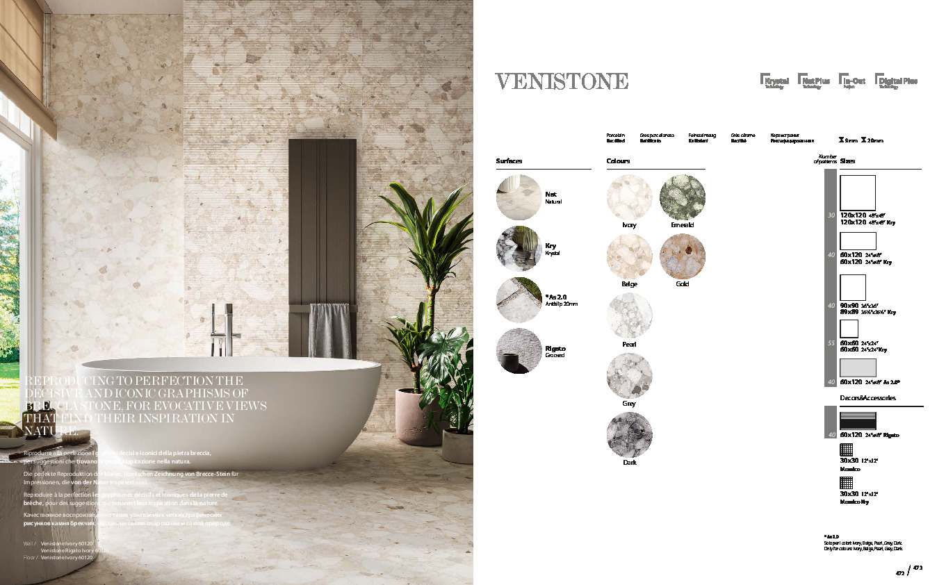 Fremstillet i høj kvalitet granitkeramik kombinerer Venistone æstetik og funktionalitet. Kollektionen fås i 10 mm og 20 mm tykkelse, med R10 skridsikkerhed for matte overflader og R11 for Rigato samt 20 mm udendørsfliser, hvilket gør den velegnet til både inde- og udebrug.