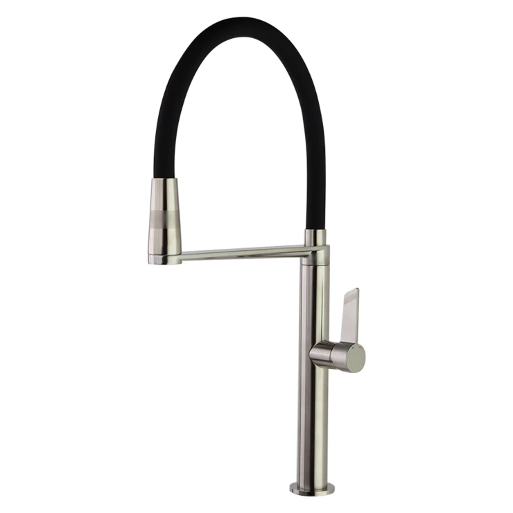 En ettgrepps köksblandare i borstad nickel med hög, elegant design. Blandaren har en orienterbar, utdragbar och 360° svängbar pip med svart silikonfinish samt ett innovativt magnetsystem som gör att munstycket smidigt återgår till sin vanliga position. Ytan har en borstad nickelfinish med PVD-behandling för extra hållbarhet och motståndskraft, kompletterat av ett patenterat korrosionsbeständigt system. Den keramiska insatsen Ø25 mm ger mjuk, exakt och stabil reglering av både temperatur och vattenflöde.