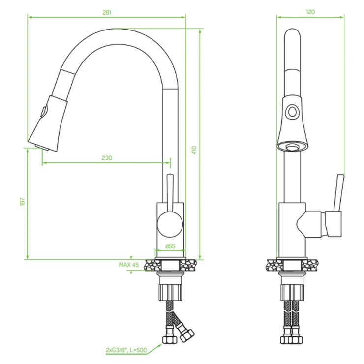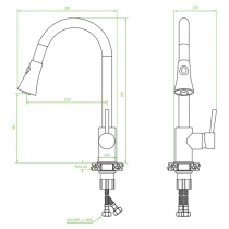 Elvar køkkenarmatur kendetegnes ved en konisk tud med en praktisk gummiknap til at skifte mellem to stråletyper – fast stråle til hurtig påfyldning og brusestråle til skånsom skylning, f.eks. af frugt.