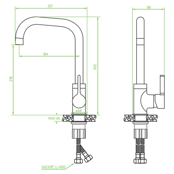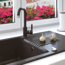 Den forkromede tudspids bryder det ensfarvede design og giver et lettere udtryk. Farverne er tilpasset for at matche populære granitvaske og skabe en ensartet helhed. Fås også i en helkromet version.