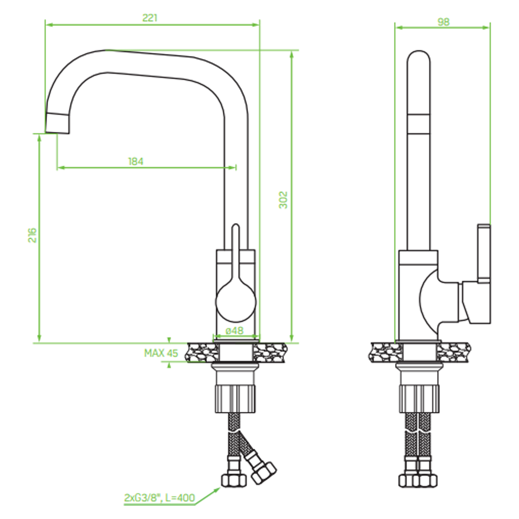 Kaldo køkkenarmatur er klassiske armaturer med L-formet tud. Det flade håndtag er let at bruge selv med våde hænder, hvilket øger komforten i hverdagen.