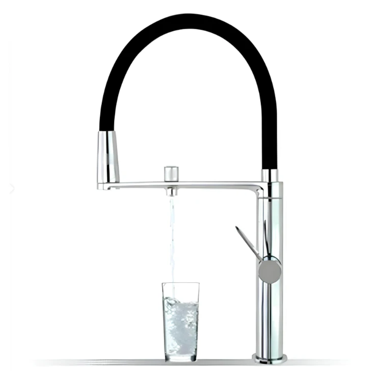 En professionell ettgrepps köksblandare med separat krets för renat vatten, vilket gör det möjligt att använda både vanligt och filtrerat vatten i samma armatur. Blandaren är utrustad med en keramisk insats Ø25 mm som ger mjuk, stabil och exakt reglering av temperatur och vattenflöde.