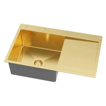 Denne køkkenvask i guld kombinerer elegant design, høj holdbarhed og praktisk funktionalitet til hverdagsbrug. Med målene 78×49 cm og en dybde på 210 mm tilbyder den en rummelig vask, der nemt rummer selv større gryder og køkkenredskaber.