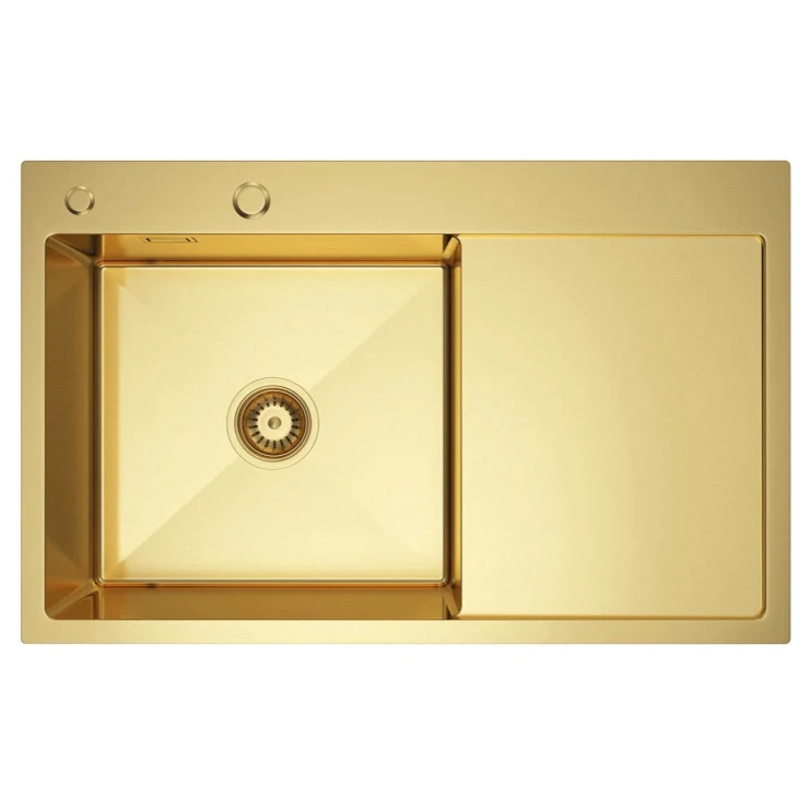 Denne køkkenvask i guld kombinerer elegant design, høj holdbarhed og praktisk funktionalitet til hverdagsbrug. Med målene 78×49 cm og en dybde på 210 mm tilbyder den en rummelig vask, der nemt rummer selv større gryder og køkkenredskaber.