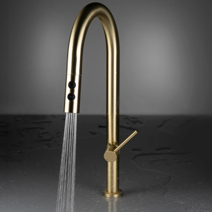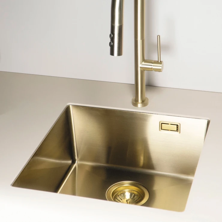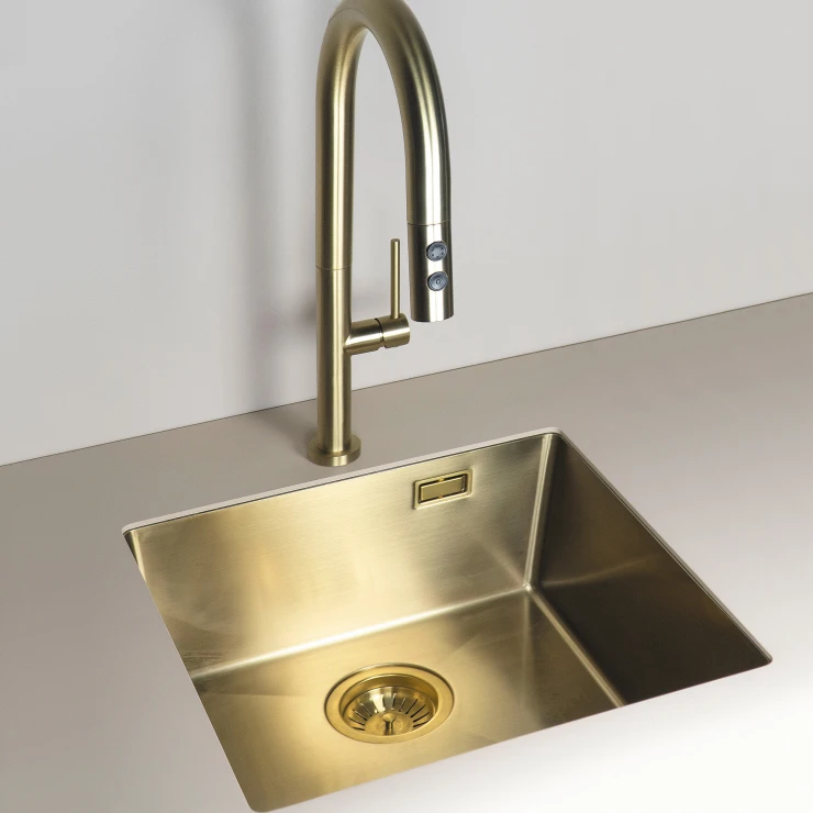 Sæt med stålvask og køkkenarmatur med udtrækkelig spray er en praktisk og stilfuld løsning til det moderne køkken. Vasken i rustfrit stål er slidstærk og let at rengøre, mens armaturet med udtrækkelig tud giver maksimal fleksibilitet ved opvask og skylning. Fås i farverne Børstet stål, Guld, Titanium og Bronze, hvilket gør det nemt at matche med både minimalistiske og eksklusive køkkenmiljøer.