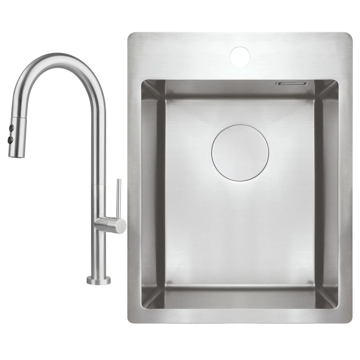 Sæt med stålvask og køkkenarmatur med udtrækkelig spray er en praktisk og stilfuld løsning til det moderne køkken. Vasken i rustfrit stål er slidstærk og let at rengøre, mens armaturet med udtrækkelig tud giver maksimal fleksibilitet ved opvask og skylning. Fås i farverne Børstet stål, Guld, Titanium og Bronze, hvilket gør det nemt at matche med både minimalistiske og eksklusive køkkenmiljøer.