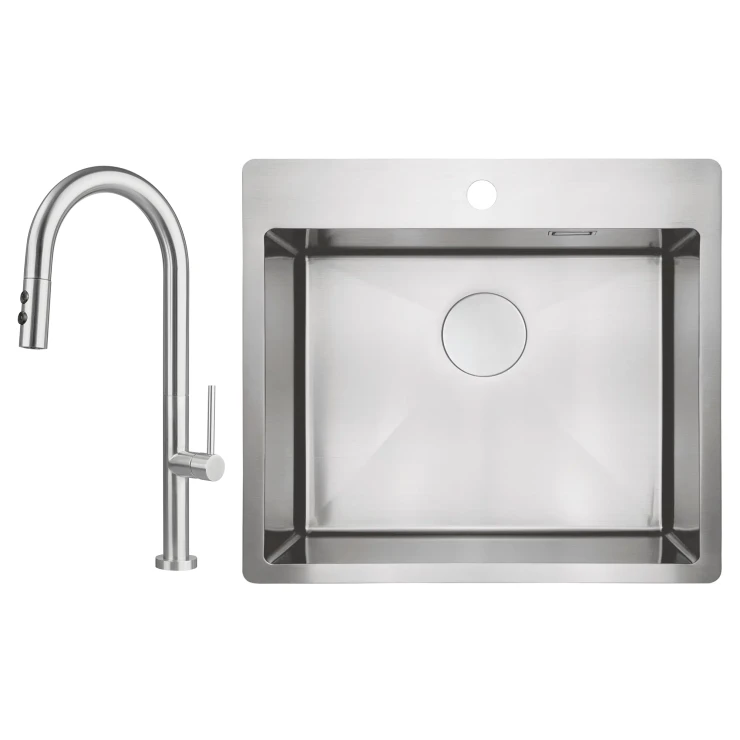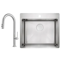 Sæt med stålvask og køkkenarmatur med udtrækkelig spray er en praktisk og stilfuld løsning til det moderne køkken. Vasken i rustfrit stål er slidstærk og let at rengøre, mens armaturet med udtrækkelig tud giver maksimal fleksibilitet ved opvask og skylning. Fås i farverne Børstet stål, Guld, Titanium og Bronze, hvilket gør det nemt at matche med både minimalistiske og eksklusive køkkenmiljøer.