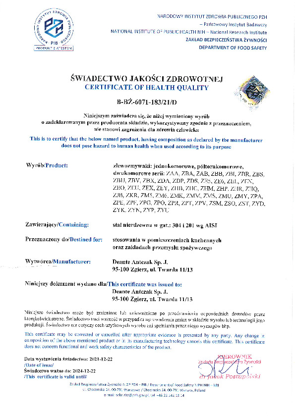 Vasken i rustfrit stål er modstandsdygtig over for temperaturer op til 250 grader Celsius, termiske chok og slag. Rustfrit stål, der anvendes til fremstilling af vaske, indeholder 18% krom, hvilket giver høj kemisk styrke, samt 10% nikkel, som giver ekstra fleksibilitet. Denne kombination resulterer i en smuk, æstetisk og konstant farve. Rustfrit stål er let at rengøre og afviser bakterier fra overfladen. Den antiseptiske belægning garanterer et højt hygiejneniveau og er nem at rengøre.