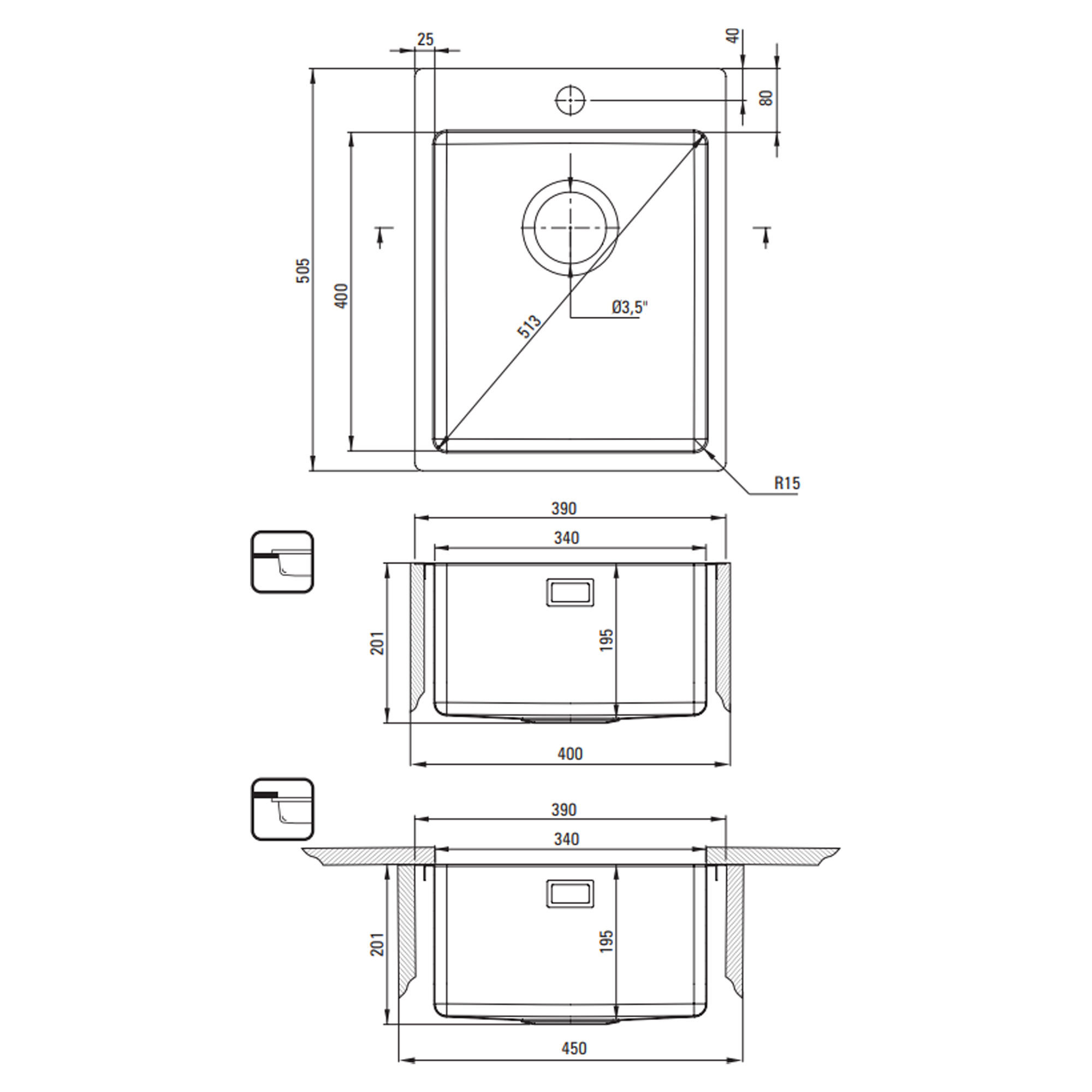 Stål Køkkenvask Olfato Bronze Mat 39x51 cm med Vandlås