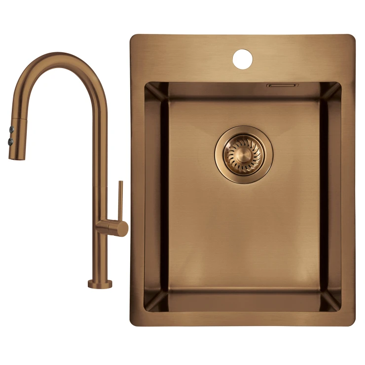Sæt med stålvask og køkkenarmatur med udtrækkelig spray er en praktisk og stilfuld løsning til det moderne køkken. Vasken i rustfrit stål er slidstærk og let at rengøre, mens armaturet med udtrækkelig tud giver maksimal fleksibilitet ved opvask og skylning. Fås i farverne Børstet stål, Guld, Titanium og Bronze, hvilket gør det nemt at matche med både minimalistiske og eksklusive køkkenmiljøer.