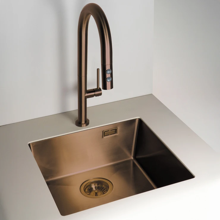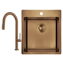 Sæt med stålvask og køkkenarmatur med udtrækkelig spray er en praktisk og stilfuld løsning til det moderne køkken. Vasken i rustfrit stål er slidstærk og let at rengøre, mens armaturet med udtrækkelig tud giver maksimal fleksibilitet ved opvask og skylning. Fås i farverne Børstet stål, Guld, Titanium og Bronze, hvilket gør det nemt at matche med både minimalistiske og eksklusive køkkenmiljøer.