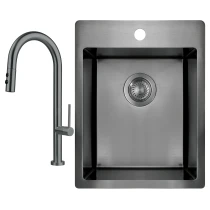 Sæt med stålvask og køkkenarmatur med udtrækkelig spray er en praktisk og stilfuld løsning til det moderne køkken. Vasken i rustfrit stål er slidstærk og let at rengøre, mens armaturet med udtrækkelig tud giver maksimal fleksibilitet ved opvask og skylning. Fås i farverne Børstet stål, Guld, Titanium og Bronze, hvilket gør det nemt at matche med både minimalistiske og eksklusive køkkenmiljøer.