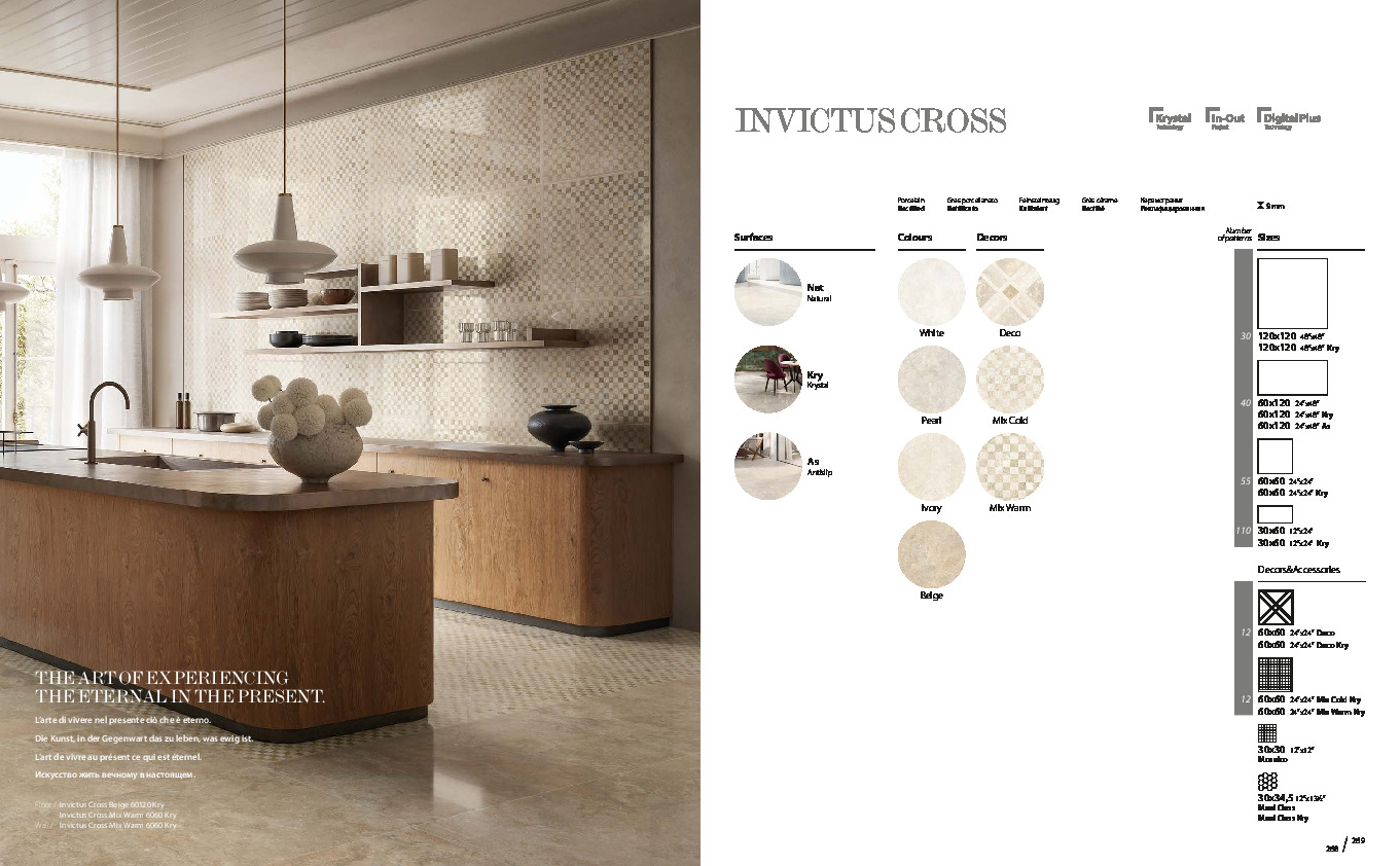 Fremstillet i rektificeret granitkeramik kombinerer Invictus Cross æstetik og funktionalitet. Serien fås i 9 mm tykkelse med R10 mat, R11 skridsikker samt poleret (Krystal) overflade. Fliserne er frostsikre og velegnede til gulvvarme.