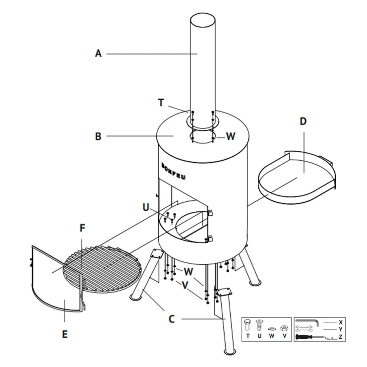 • BonTon inkluderar gnistskydd, askkopp, eldgaffel och vedgaller.